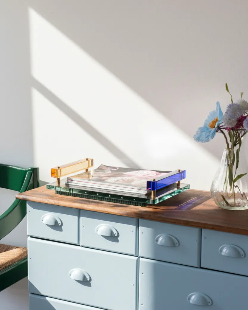 The Crystal Panama Tray byReflections Copenhagenreimagines the traditional serving tray through bold crystal design and architectural form. Known for sculptural pieces that play with color and light, the brand treats crystal as a medium for collectible design rather than decoration. Each tray is hand-cut and assembled by artisans, resulting in faceted surfaces that catch and shift light beautifully. Use it to serve cocktails, hold fruit, or let it stand alone as a statement object on a table or console. A confident gift for design collectors or anyone drawn to objects that feel intentional, luminous, and lasting.