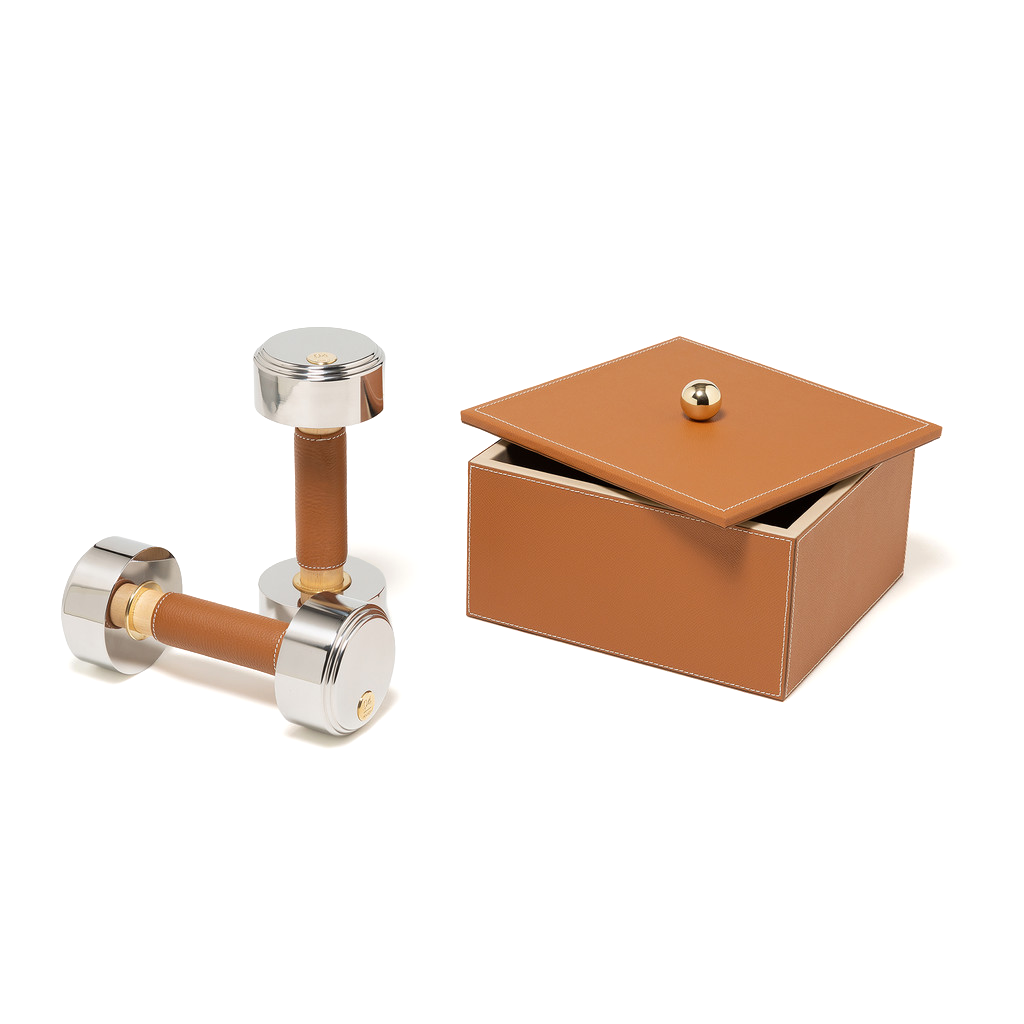Each dumbbell is crafted from polished stainless steel with solid beechwood handles, wrapped in Weinheimer’s Odessa calf leather for a comfortable, secure grip. The weight feels balanced and intentional in hand, while the leather detailing adds warmth and refinement to every movement.